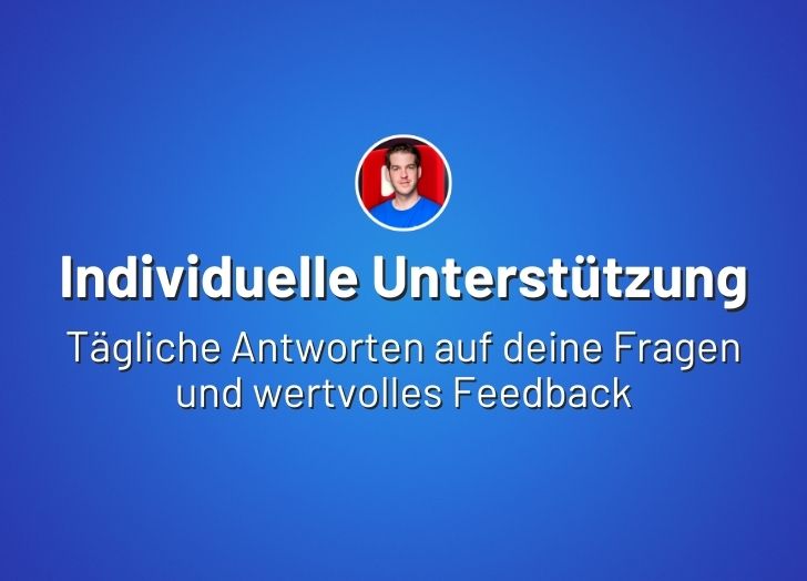 Und außerdem bin ich Tag für Tag an deiner Seite – für Fragen und Feedback, das dich sofort weiterbringt. Nie mehr alleine Raten was du jetzt machen solltest! Du hast jederzeit einen erfahrenen Ansprechpartner an der Seite.